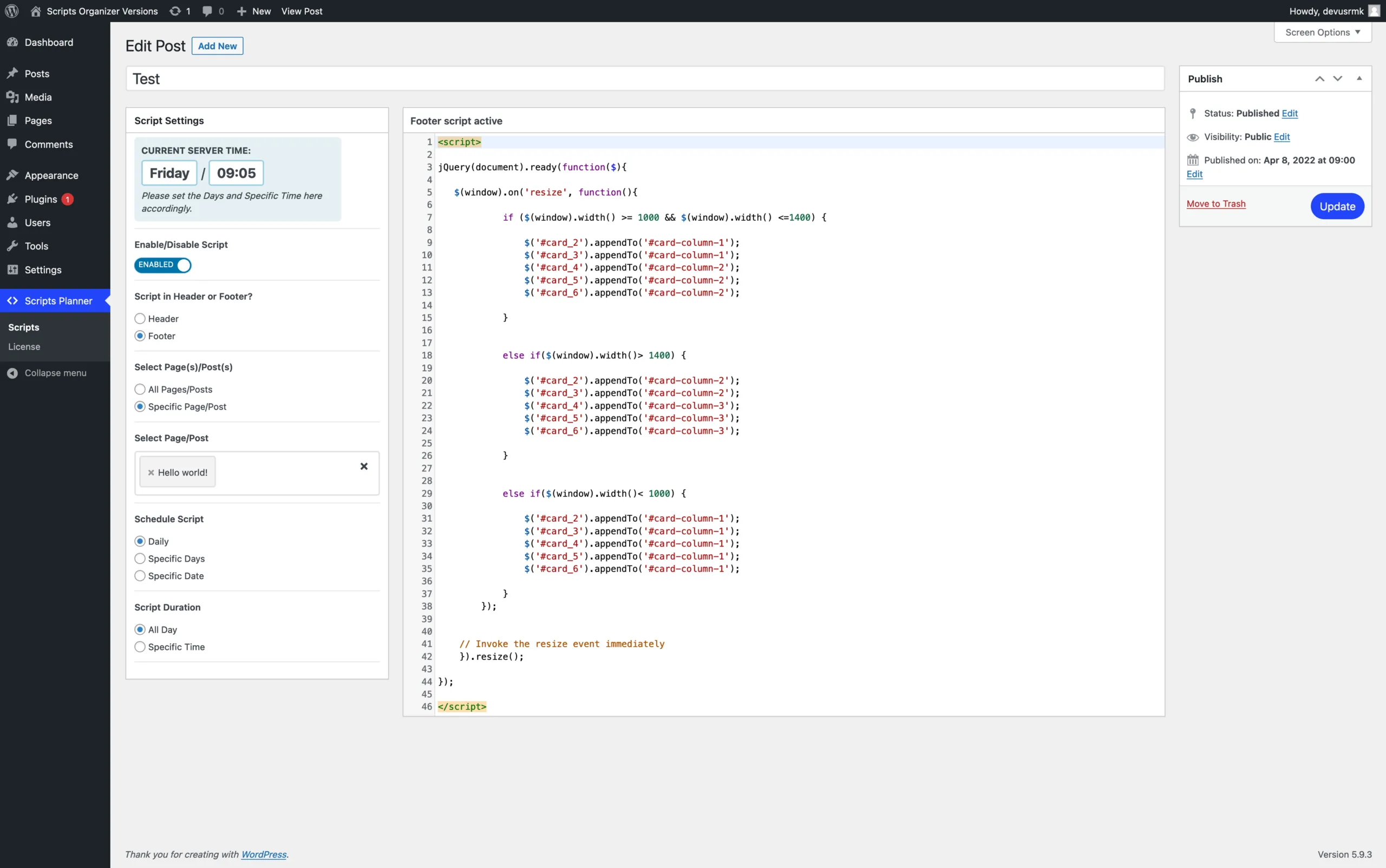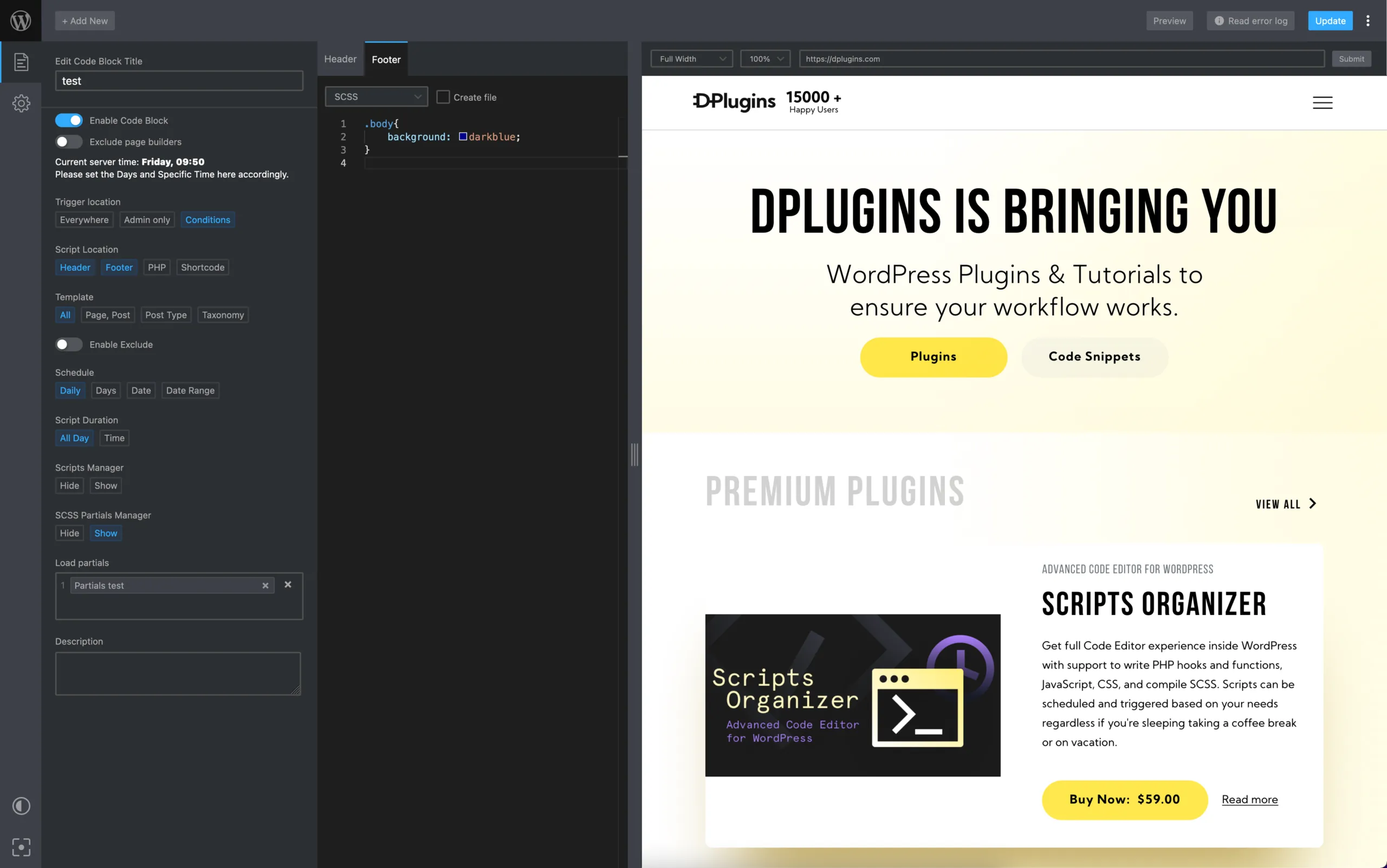 Built for WordPress designers, developers and agencies who are tired of the localhost→staging→live dance. Scripts Organizer lets teams write and preview code directly in WordPress — same collaboration model as editing posts, but for custom code.